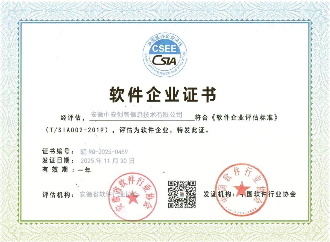 软件企业认证由安徽省软件行业协会评估、中国软件行业协会颁发,是衡量企业软件研发水平、知识产权储备及规范管理能力的重要标尺。此次认证的取得,是对我们在软件自主研发领域技术实力的肯定,彰显了中安创智在智慧产业生态中的核心竞争力,更为我们助力区域数字化转型提供了坚实保障。